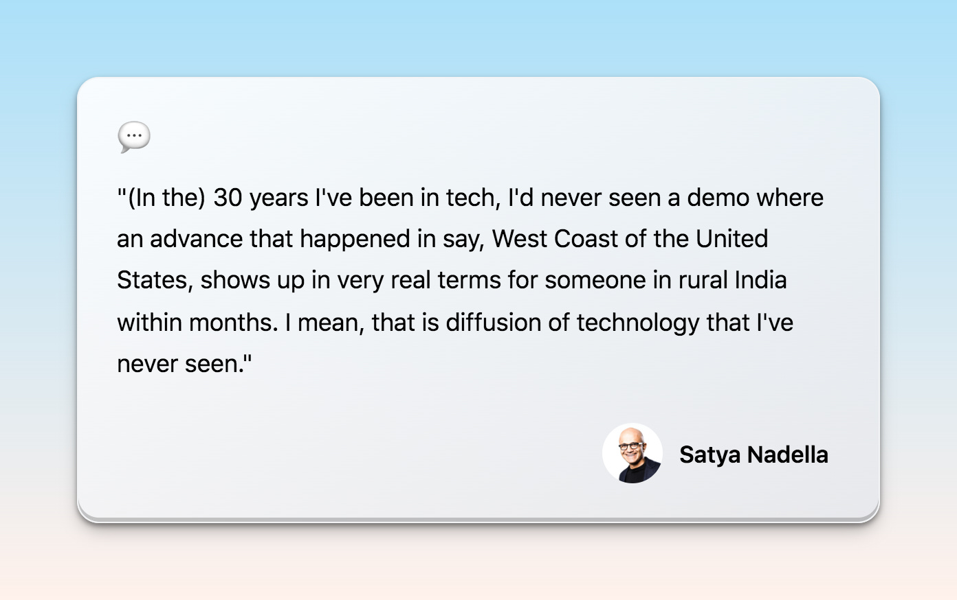 Nadella sees artificial intelligence as a major breakthrough moment in the history of tech. To provide some insight into Nadella’s current train of thought, he referenced a tweet from a former Tesla AI developer who said 80% of the code he writes today is being written by GitHub Copilot. In another, he talked about a demo in India where a person in rural India was able to access a government program through a bot on WhatsApp, thanks to GPT training on government documents.