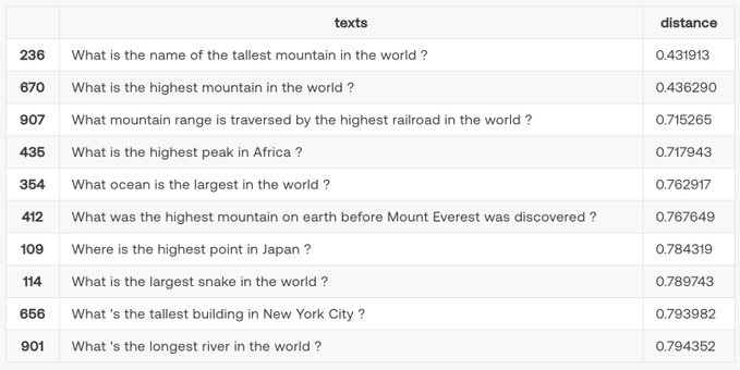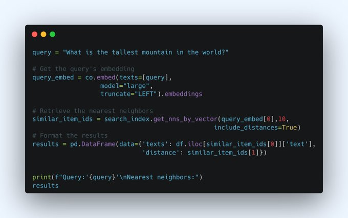 Step 4: Find the closest match to a query Now, we can use this to search in the archive based on a given query. Here, the query is: "What is the tallest mountain in the world?" The code snippet below shows the steps.