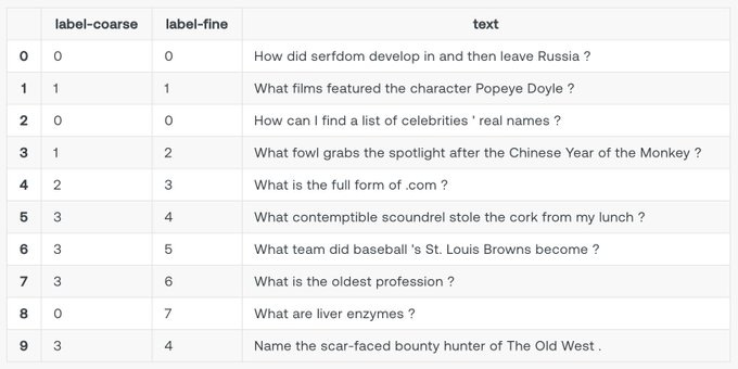 Step 1: Get a list of text to search from Here, we use an archive of questions as an example. They come from the âtrecâ dataset, which is made up of questions and their categories.