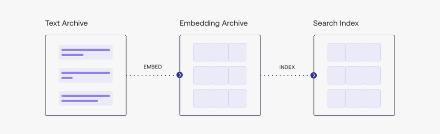 Step 3: Turn the embeddings into indexes Next, we turn each embedding into a search index. For example, we can use a library called âannoy,â created by Spotify, to do nearest neighbor search, which finds the point in a given set that is closest to a given point.