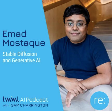 Stable Diffusion & Generative AI with Emad Mostaque - The TWIML AI Podcast with Sam CharringtonThe pod's host, Sam Charrington, interviews Emad Mostaque, the founder and CEO of Stability.ai (do you need an introduction??), a company that has gained popularity in the generative AI space with the release of its stable diffusion model. The conversation covers the background of Stability's creation, the model's speed and scale, the relationship between stable diffusion and programming, and the areas that Emad expects to be disrupted by this technology (which *spoiler alert* is everything). The discussion also covers the open-source vs API debate, user safety and artist attribution concerns, and the infrastructure used to support the model.