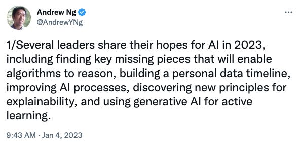 🐦 Andrew NGAndrew tweets about the hopes and predictions for AI in 2023 by several leaders in the field. Some of the highlights include finding ways for algorithms to reason, creating a personal data timeline, improving AI processes, discovering new principles for explainability, and using generative AI for active learning.